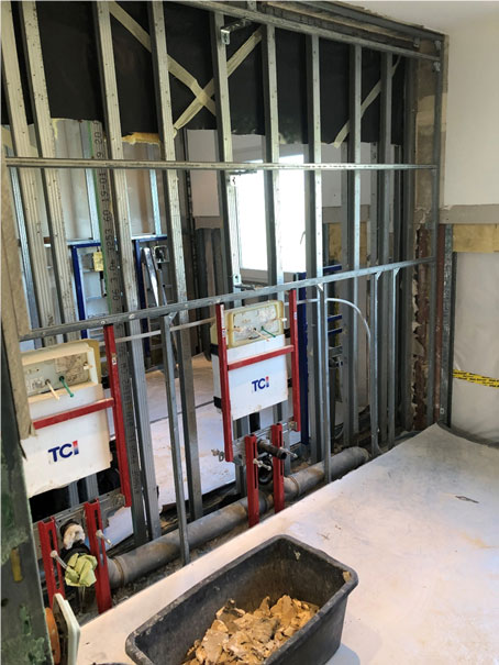 Danach erfolgt der Wiederaufbau mit neuen Wänden, neuen Fliesen und auch neuen Türen.
